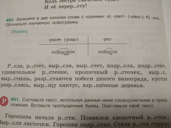 490. Запишите в две колонки слова с корнями: а) -раст- (-ращ-); б) -рос-. Обозначьте изучаемую орфограмму.