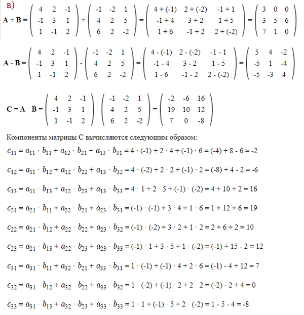б) При сложении и вычитании матрицы должны иметь одинаковый размер Сумму и разность найти нельзя. Только произведение.