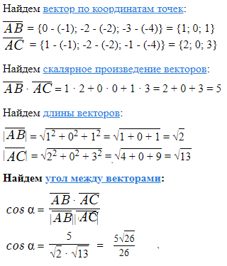 Даны вершины треугольника A(-1; -2; -4), B(0; -2; –3) и C(1; -2; -1). Найти внутренний угол при вершине A.