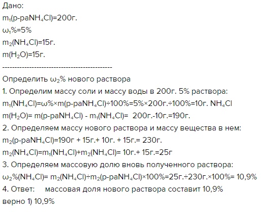 К 200 г 5%-ного раствора хлорида аммония добавили 15 г этой же соли и столько же граммов воды. Чему равна доля хлорида аммония в получившемся растворе?