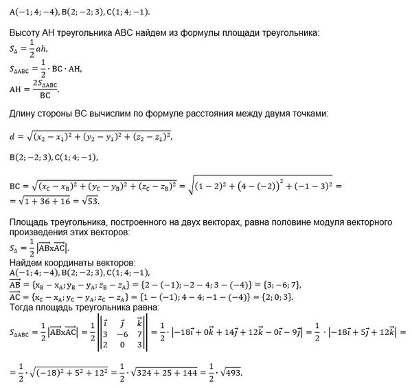 Даны вершины треугольника A(–1;4;–4), B(2;–2;3) и C(1;4;–1). Вычислите длину его высоты, опушенной из вершины A на сторону BC.