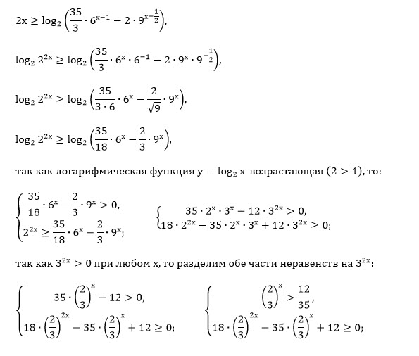 [m]log_{2}2^{2x}\geq log_{2}(\frac{35}{3}\cdot 6^{x-1}-2\cdot9^{x-\frac{1}{2}})[/m]