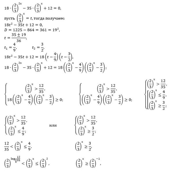 [m]\left\{\begin{matrix} 18\cdot (\frac{2}{3})^{2x}\geq 35\cdot (\frac {2}{3})^{x}-12 \\ 35\cdot (\frac{2}{3})^{x}-12 >0\end{matrix}\right.[/m]