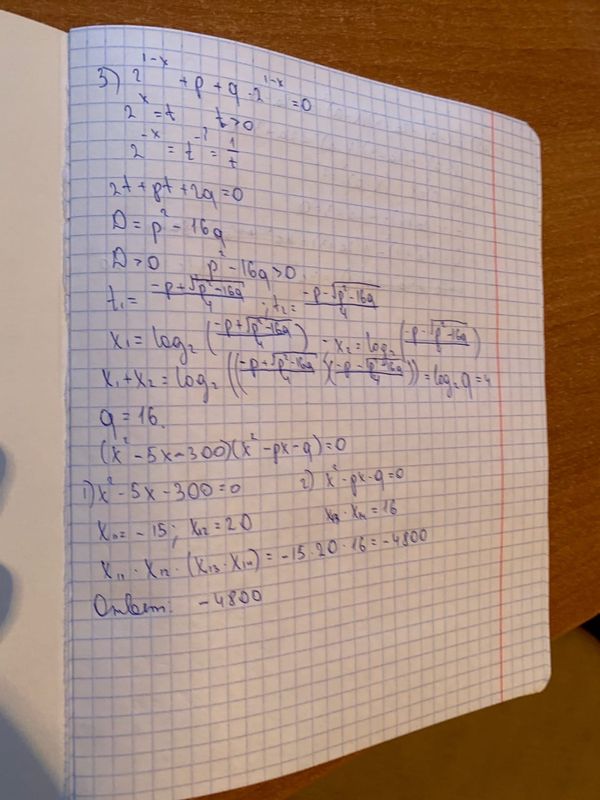 3(4). Числа p и q таковы, что уравнение 2^(1+x) + p + q * 2^(1 - x) = 0 имеет два различных корня, сумма которых равна 4. Найдите произведение различных корней уравнения (x^2 - 5x - 300)(x^2 - px - q) = 0.