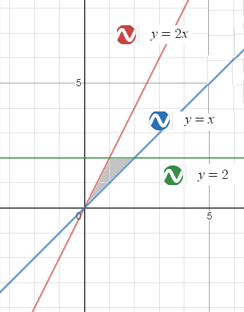 S= ∫ ∫ _(D)dxdy= ∫ ^(2)_(0) [b]([/b]∫ ^(y)_((1/2)y)dx[b])[/b]dy=