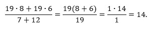 [m]\frac{19\cdot 8+19\cdot 6}{7+12}=\frac{19\cdot(8+6)}{19}=\frac{19\cdot14}{19}=14[/m]