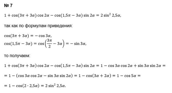 7) 1 + cos(3π + 3α)cos2α - cos(1,5π - 3α)sin2α = 2sin²2,5α;