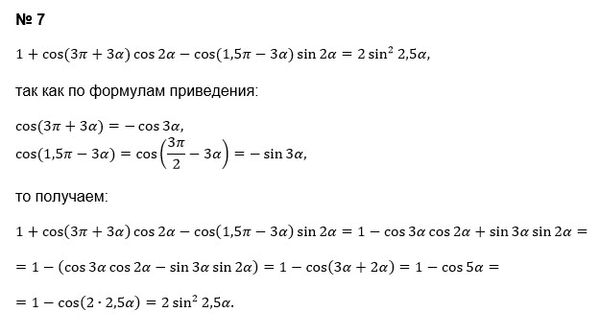 7) 1 + cos(3π + 3α)cos2α - cos(1,5π - 3α)sin2α = 2sin²2,5α;
