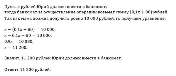Юрий Деточкин хочет отправить маме перевод на 10 тыс. рублей. Банкомат за осуществление этой операции взимает комиссию: 80 руб. + 10% от суммы перевода. Какую сумму в рублях должен внести Юрий в банкомат, чтобы его мама получила ровно 10 тыс. рублей?