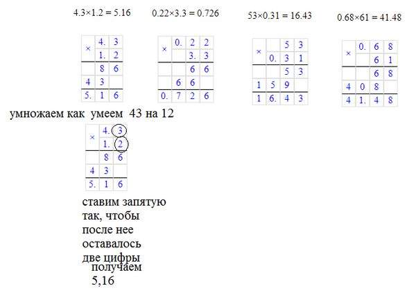 умножить столбиком. а) 2,3 ·1,1 б)4,3 · 1,2 в) 0,22 · 3,3 г)53 · 0,31 д) 0,68 · 61 е) 0,72 · 0,015 ж) 4,35 · 2,2 з)3,2 · 0,25 и) 0,084 · 0,55