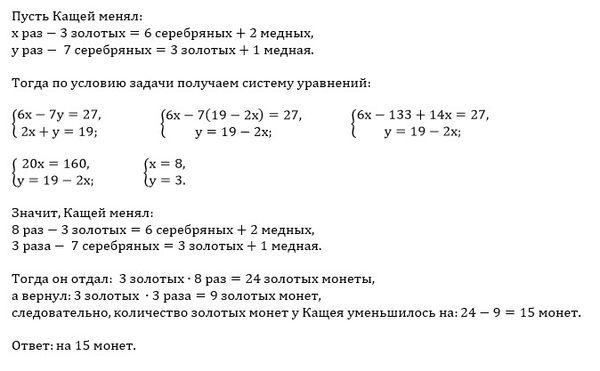 У Кащея были только золотые монеты. После нескольких посещений обменного пункта монет с него стало меньше, зато появилось 27 серебряных монет и 19 медных. На сколько уменьшилось количество золотых монет у Кащея?