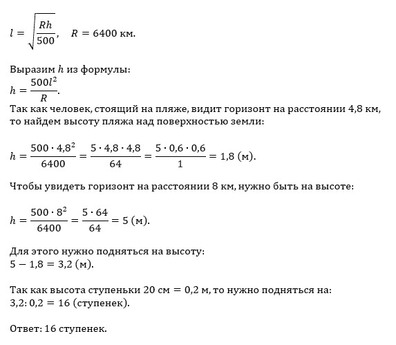 Человек, стоящий на пляже, видит горизонт на расстоянии 4,8 километра. К пляжу ведёт лестница, каждая ступенька которой имеет высоту 20 см. На сколько ступенек ему нужно подняться, чтобы он увидел горизонт на расстоянии 8 километров? [в7-10]