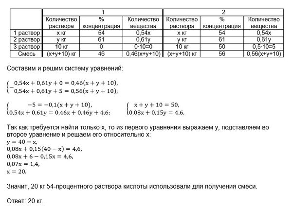 Если смешать 54-процентный раствор кислоты и 61-процентный раствор этой же кислоты и добавить 10 кг чистой воды, получится 46-процентный раствор кислоты. Если бы вместо 10 кг воды добавили 10 кг 50-процентного раствора той же кислоты, то получили бы 56-процентный раствор кислоты. Сколько килограммов 54-процентного раствора использовали для получения смеси? [в7-11]