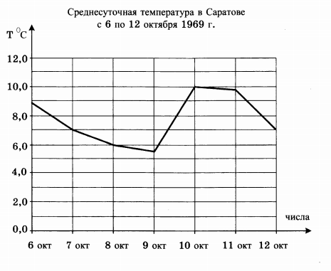 На рисунке изображён график среднесуточной температуры в г. Саратове в период с 6 по 12 октября 1969 г. На оси абсцисс откладываются числа, на оси ординат — температура в градусах Цельсия. Определите по графику, какая была средняя температура 8 октября. Ответ дайте в градусах Цельсия.