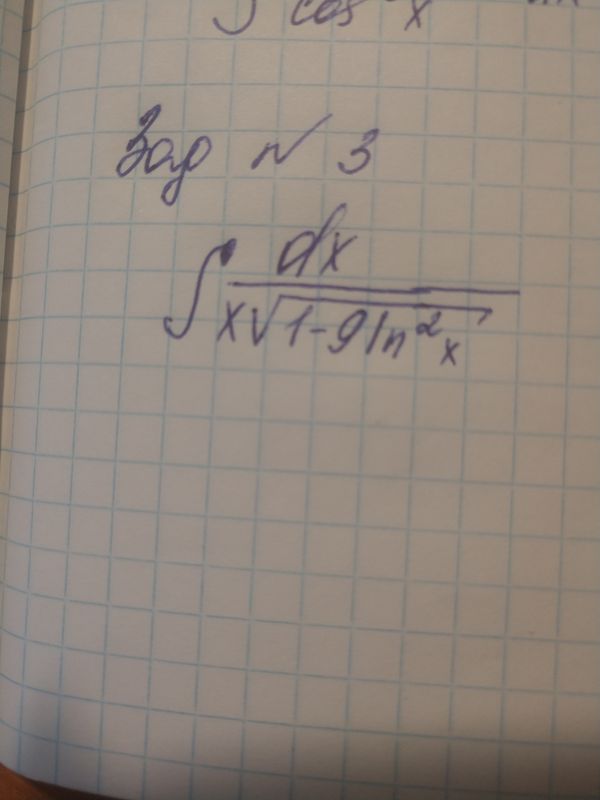 [m]\int \frac{dx}{x\sqrt{1-9ln^2x}}=\frac{1}{3}\int \frac{3dx}{x}\frac{1}{\sqrt{1-(3lnx)^2}}=[\int \frac{du}{\sqrt{1-u^2}}=]=\int \frac{d(3lnx)}{\sqrt{1-(3lnx)^2}}[/m]