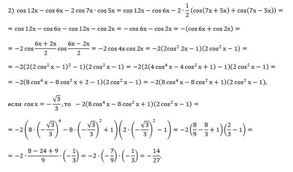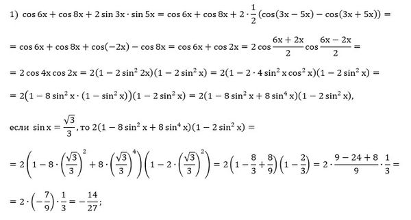 28.12. Найдите значение выражения: 1) cos6x + cos8x + 2sin3x ⋅ sin5x, если sinx = [m]\frac{\sqrt[3]}{3}[/m]; 2) cos12x - cos6x - 2cos 7x ⋅ cos 5x, если сos x = [m]-\frac{\sqrt[3]}{3}[/m].