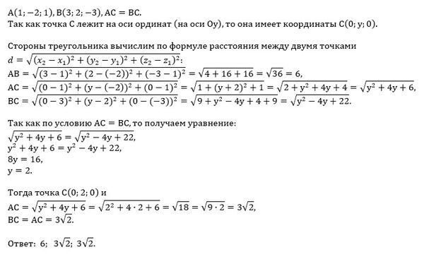 Дан равнобедренный треугольник ABC (AC = CB), где A(1; ‒2; 1), B(3; 2; ‒3).Точка C лежит на оси ординат. Найдите стороны треугольника ABC.
