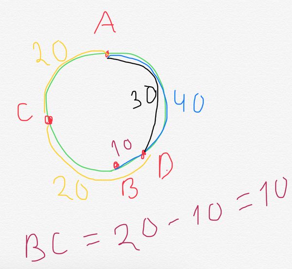 На кольцевой дороге расположены четыре бензоколонки: A, B, C и D. Расстояние между A и B — 40 км, между A и C — 20 км, между C и D — 20 км, между D и A — 30 км (все расстояния измеряются вдоль кольцевой дороги в кратчайшую сторону). Найдите расстояние между B и C.
