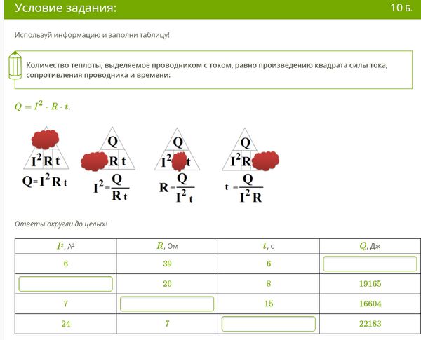 Используй информацию и заполни таблицу! Количество теплоты, выделяемое проводником с током, равно произведению квадрата силы тока, сопротивления проводника и времени:
