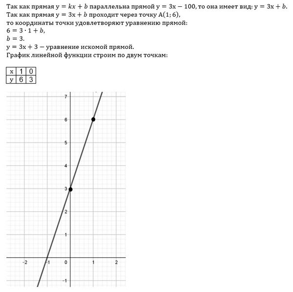 построй прямую y=kx+b если известна что она паралельна прямой y=3x-100 и проходит через точку А(1;6)