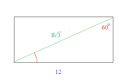 Вычисли меньшую сторону и площадь прямоугольника, если его большая сторона равна 12 дм, диагональ равна 8√3 дм и образует с меньшей стороной угол 60 градусов. Меньшая сторона = −−−−−√ дм. Площадь прямоугольника равна −−−−−−−√ дм2. (Если необходимо, ответы округли до сотых.)