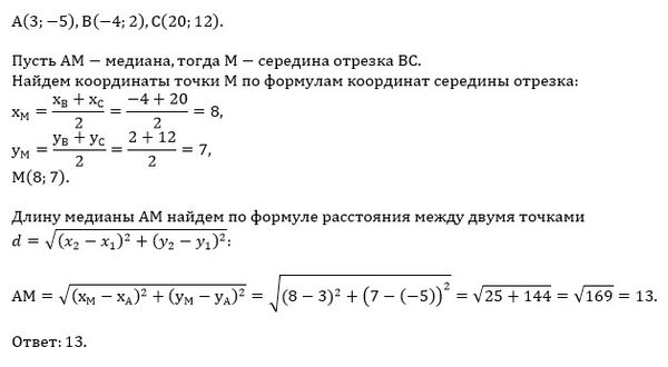 13. Даны вершины треугольника — A(3; -5), B(-4; 2), C(20; 12). Найдите медиану, проведённую из вершины A