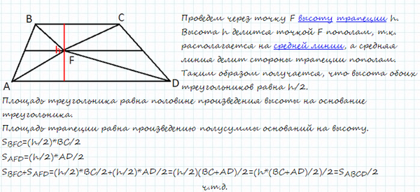 На средней линии трапеции ABCD с основаниями AD и ВС выбрали произвольную точку F. Докажите, что сумма площадей треугольников BFC и AFD равна половине площади трапеции.