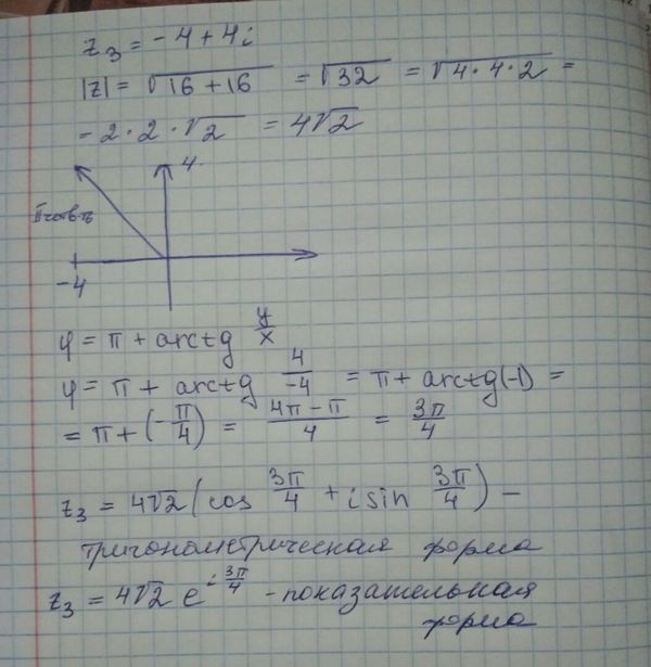 Запишите комплексное число z₃ = -4 + 4i в тригонометрической и показательной форме.