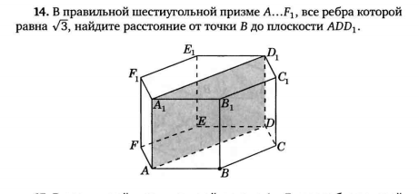 14. В правильной шеститутольной призме А...F_1, все ребра которой равна √3, найдите расстояние от точки В до плоскости ADD₁.