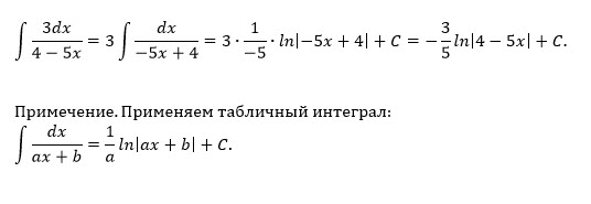 [m]\int \frac{3dx}{4-5x}=3\cdot \frac{1}{(-5)}\int \frac{(-5)dx}{4-5x}=-\frac{3}{5}\int \frac{d(4-5x)}{4-5x}=[/m][m]=-\frac{3}{5} \int \frac{du}{u}=-\frac{3}{5}ln|u|+C=-\frac{3}{5}ln|4-5x|+C[/m]