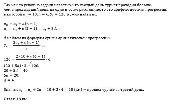 Турист идёт из одного города в другой, каждый день проходя больше, чем в предыдущий день, на одно и то же расстояние. Известно, что за первый день турист прошел 10 километров. Определите, сколько километров прошёл турист за третий день, если весь путь он прошёл за 6 дней, а расстояние между городами составляет 120 километров. (20)