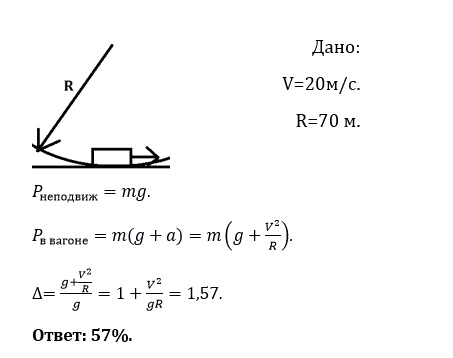 Вагон движется в горизонтальной плоскости со скоростью 20 м/с по закруглению радиусом 70 м. На сколько процентов возрастет вес груза в движущемся вагоне по сравнению с весом груза в неподвижном вагоне? Принять g = 10 м/с^2.