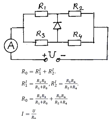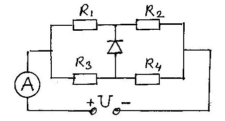Цепь собрана из четырех резисторов, идеалного диода и идеального амперметра (см. рис.). R1 = 5 Ом, R2 = 5 Ом, R3 = 8 Ом, R4 = 2 Ом, U = 9 B. Найдите показание амперметра.