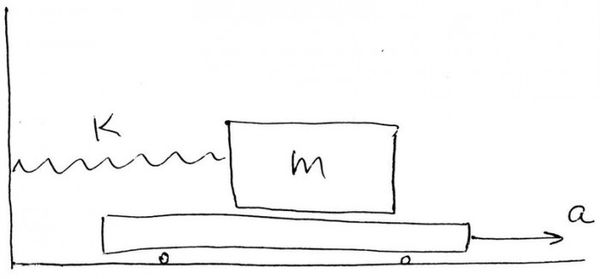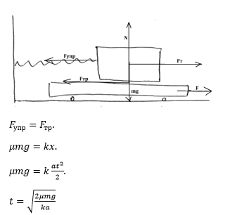На горизонтальной поверхности стола лежит длинная доска, на которую помещён брусок массы m=8 кг. Брусок соединён с неподвижной стенкой лёгкой горизонтальной нерастянутой пружиной жёсткости k=40 Н/м. В начальный момент система покоится. Коэффициент трения между доской и бруском равен μ=0,28. Между доской и столом трения нет. Доску начинают двигать горизонтально с постоянным ускорением a = 2,4 м/с^2. Через какое время после начала движения доски начнётся проскальзывание между бруском и доской? Ответ выразите в секундах и округлите до сотых. Принять g = 10 м/с^2.