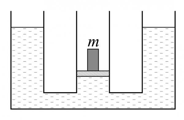 Даны три сообщающихся сосуда с площадью поперечного сечения S = 0.005 м^2, заполненные ртутью до некоторой высоты. В средний помещают гирю массой m = 2 кг на невесомой площадочке, заполняющей всё сечение сосуда. В начальный момент зазора между площадочкой и ртутью нет, а начальная скорость гири с площадочкой равна нулю. Определите, какое количество теплоты выделилось до установления равновесия. Ответ дайте в единицах СИ и округлите до сотых.