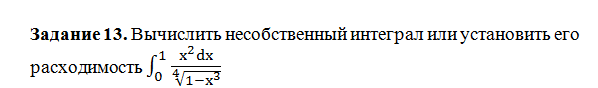 [m]\int^{1}_{0}\frac{x^2dx}{\sqrt[4]{1-x^3}} =\lim_{\varepsilon\to 0}\int^{1-\varepsilon }_{0}\frac{x^2dx}{\sqrt[4]{1-x^3}} =-\frac{1}{3}\lim_{\varepsilon \to 0}\int^{1-\varepsilon }_{0}\frac{(-3x^2dx)}{\sqrt[4]{1-x^3}}=[/m][m]-\frac{1}{3}\lim_{\varepsilon \to 0}\int^{1-\varepsilon }_{0}(1-x^3)^{-\frac{1}{4}}d(1-x^3) =[/m]