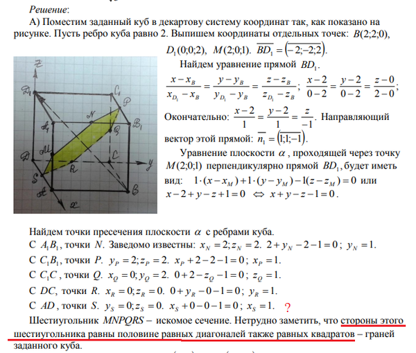 а) Докажите, что сечение куба плоскостью, проходящей через центр куба перпендикулярно диагонали АС1 является правильным шестиугольником.