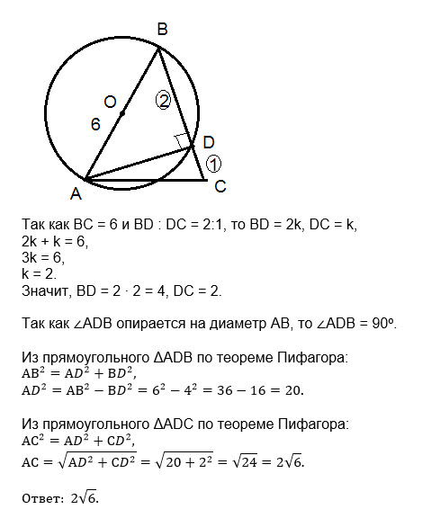 В равнобедренном треугольнике АВС боковые стороны АВ и ВС равны 6. На стороне АВ как на диаметре построена окружность, пересекающая ВС в точке D так, что BD:DC=2:1. Найдите длину стороны АС.