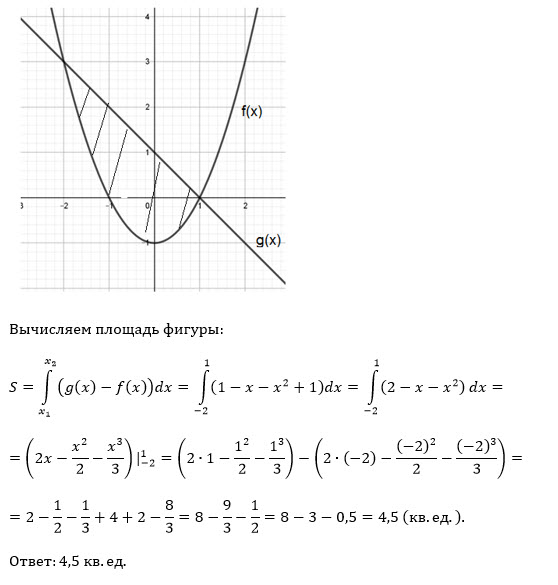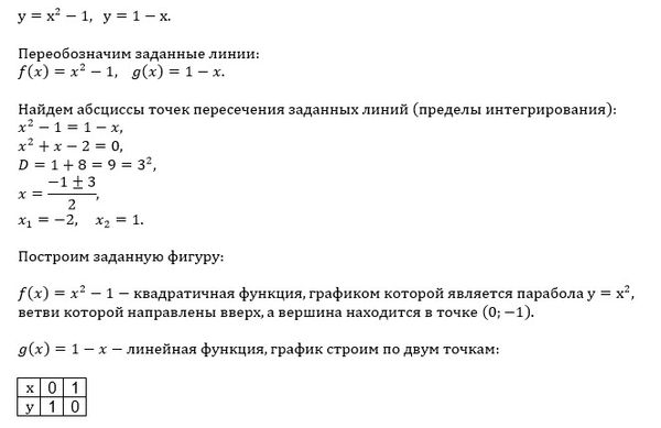 Найти площадь фигуры, ограниченной линиями y = x^2 - 1, y = 1 - x