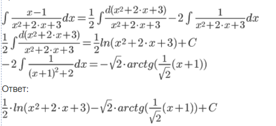 О т в е т.[m] -\frac{x+2}{2(x^2+2x+3)} -\frac{1}{2\sqrt{2}}arctg\frac{x+1}{\sqrt{2}}+C[/m].
