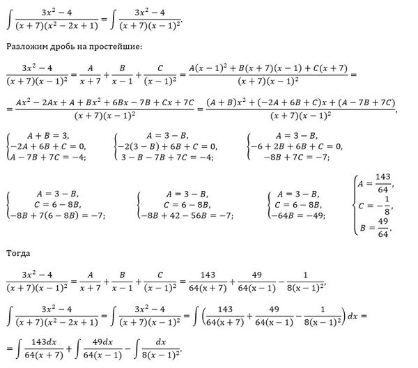 \int (\frac{A}{x+7}+\frac{B}{x-1}+\frac{D}{(x-1)^2})dx=[/m][m]=Aln|x+7|+Bln|x-1|-D\frac{1}{x-1}+C[/m]
