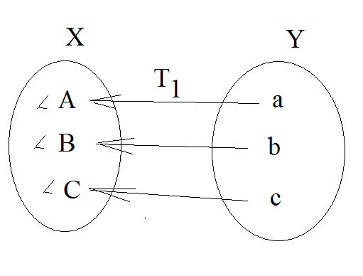 X={ ∠ A; ∠ B; ∠ C} Y={a;b;c} Т-" угол А против стороны а и угол В против стороны b и угол С против стороны с" Т_(1)="сторона а против угла А и сторона b против угла b и сторона с против угла С" б)