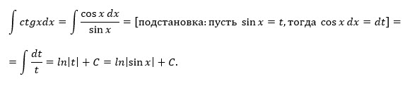 По формуле ∫ du/u=ln|u|+C [m]∫ ctgxdx= ∫ \frac{cosxdx}{sinx}= ∫ \frac{d(sinx)}{sinx}=ln|sinx|+C[/m] так как d(cosx)=(cosx)`dx=sinxdx Для этого и изучали [i]дифференциалы[/i].