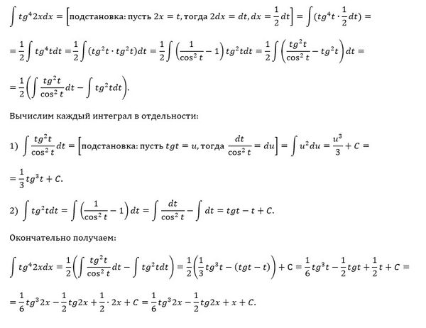 [m]\int tg^42xdx=\int tg^22x\cdot (\frac{1}{cos^22x}-1)dx=\int tg^22x\cdot \frac{dx}{cos^22x}-\int tg^22xdx=[/m]