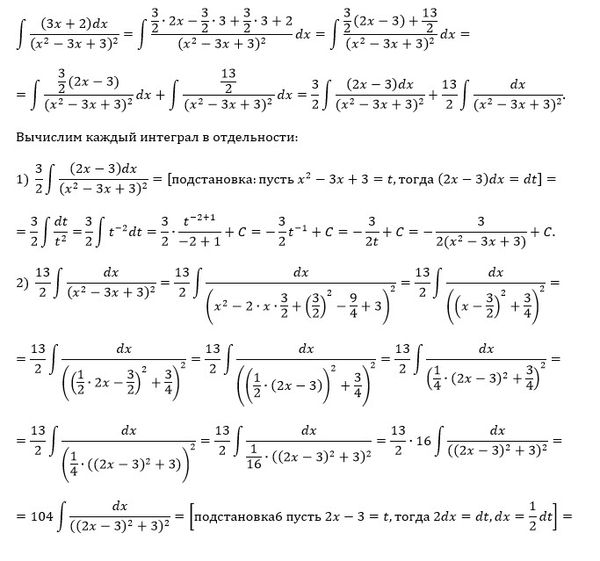 [m]∫ \frac{(3x+2)dx}{(x^2–3x+3)^2}= ∫ \frac{(3t+6,5)dt}{(t^2+0,75)^2}=[/m]