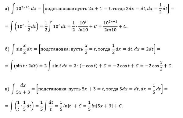 Задание 2. Проинтегрировать подходящей заменой переменного. a) ∫10^(2x+1) dx б) ∫ sin (x/2) dx в) ∫ dx / (5x + 3)