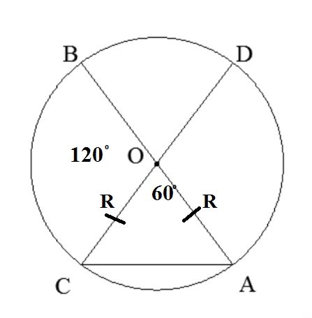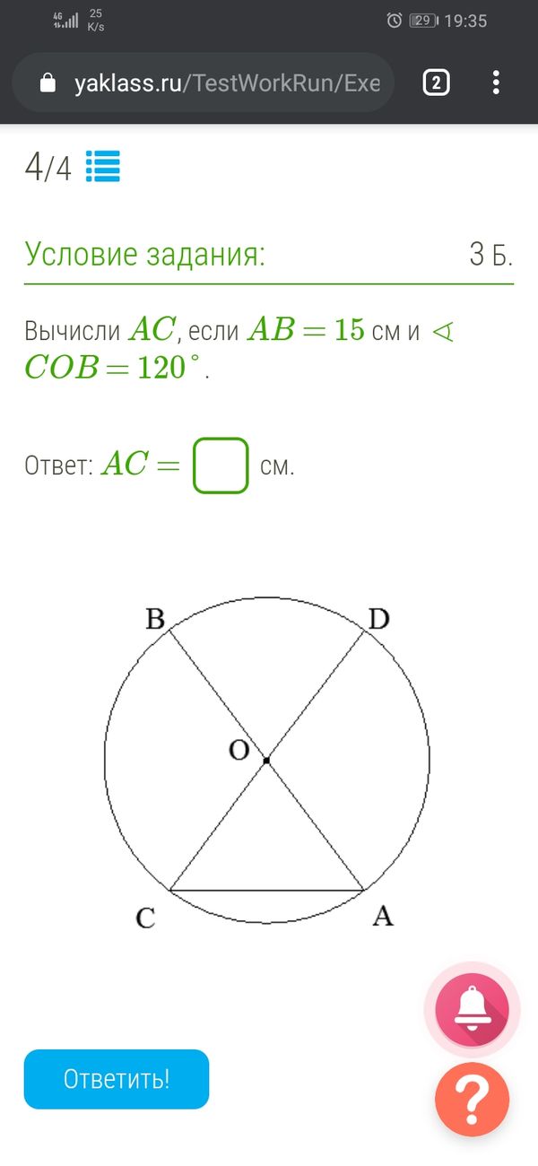 Вычисли AC, если AB = 15 см и ∢ COB = 120°. Ответ: AC = см.