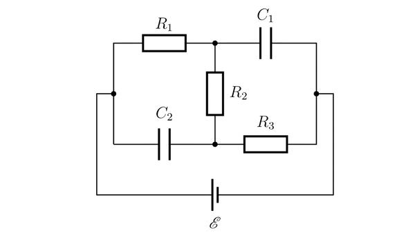 Электрическая цепь, схема которой изображена на рисунке, состоит из трёх сопротивлений 1 Ом, 2 Ом, 3 Ом, двух конденсаторов с ёмкостями 1мкФ, 2мкф и источника с ЭДС 12 В. Найдите заряд конденсатора Ответ выразить в мкКл округлив до целых.