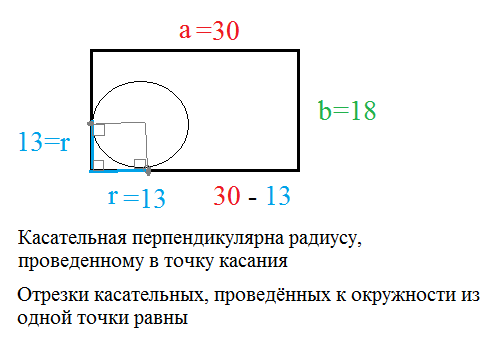 Окружность с радиусом 13 касается двух смежных сторон прямоугольника длиной 18 и 30 . На какие отрезки она делит большую из оставшихся сторон прямоугольника?