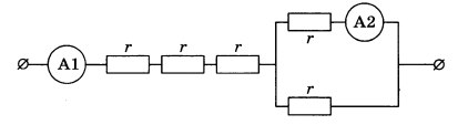 Участок цепи постоянного тока состоит из пяти одинаковых резисторов по 2 Ом каждый. Амперметр А2 показывает силу тока в 1 А. Чему равны общее электрическое сопротивление участка цепи и сила тока, которую показывает амперметр А1? Сопротивлением амперметров пренебречь.